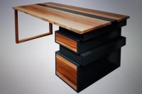 Dieses Gesellstück wurde in 120 Stunden angefertigt. Die Schreibtischplatte und die seitlichen Füße sind aus Bubinga furnierten 40 mm dicken Spanplatten. Zwischen den Füßen befinden sich auf der einen Seite ein abschließbarer Schrank für Unterlagen, auf der anderen Seite ein Fach für einen Computer. Die beiden Fächer sind aus furniertem Ahron erstellt. Trotz der 40 mm dicken Platte und Füße wirkt der Schreibtisch luftig und leicht, was durch die Bauweise mit Abstandshalter aus Edelstahl kommt. Die Schränke und die Platte schweben und sind nur durch die Abstandshallter von den umliegenden Bauteilen miteinander verbunden. Für dieses Stück gewann Michael Stalla beim Landesinnungswettbewerb "die Gute Form" den dritten Platz.